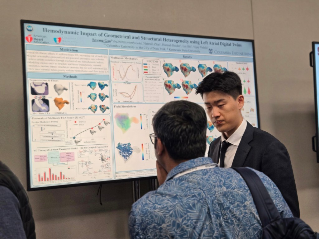 A big shoutout to Bryan for his exciting work on computational modeling of left atrial (LA) mechanics and blood flow, taking variable tissue thickness into account. This makes a seminal contribution to the field, as LA is traditionally understudied compared to the ventricular counterpart, and its geometrical variations remain less characterized due to a lack of sufficient data. The work was presented at the 78th Annual Meeting of the APS Division of Fluid Dynamics, held from November 23-25, 2025, in Houston, TX. We thank the US National Science Foundation and the American Heart Association for supporting this work.